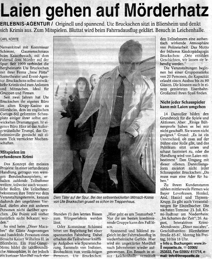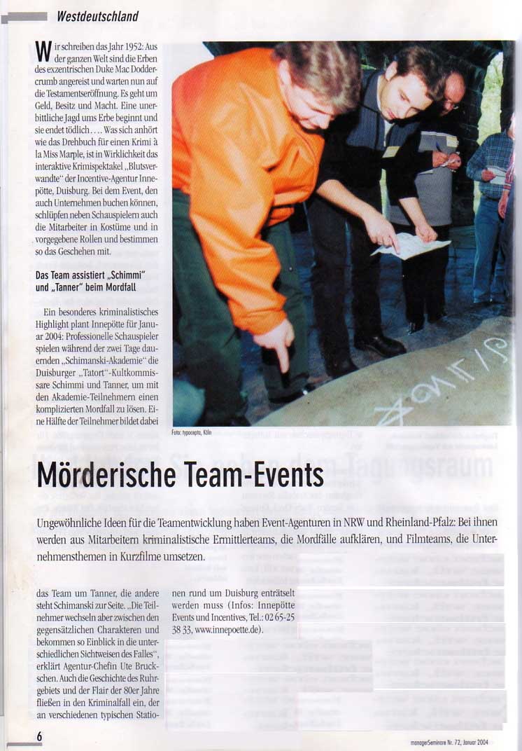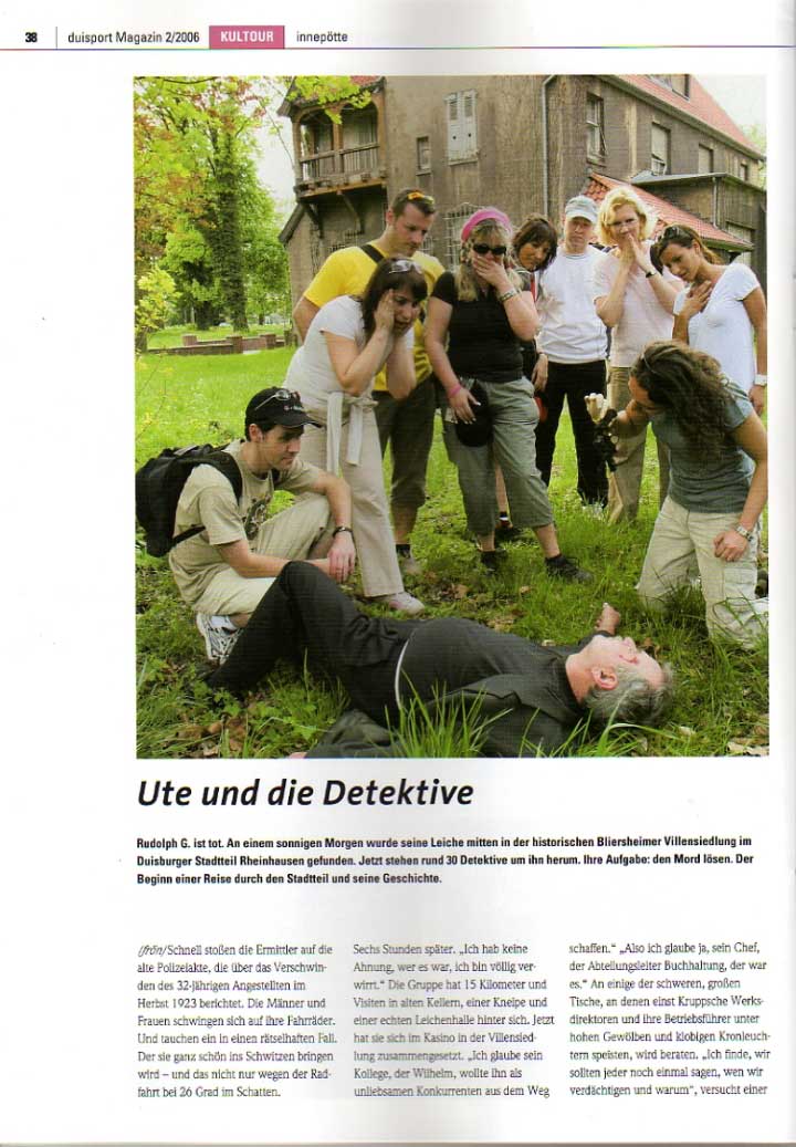 “Trotz der anstrengenden äußeren Bedingungen (35 Grad Außentemperatur) haben sich alle Teilnehmer sehr positiv über das KrimiSpiel im Kloster Eberbach geäußert. Es war sehr schön integriert in die Szenerie des Klosters und die Geschichte per se war sehr spannend...