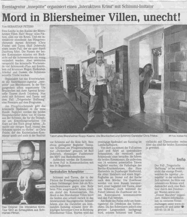 “Bewertung KrimiRallye Doppelmord: ++ Flexibilität bezüglich unserer Wünsche und Vorgaben, ++ sehr gute Vorarbeit durch die vorherige Besichtigung der möglichen Orte, ++ sehr guter telefonischer Kontakt und Erreichbarkeit, ++ Verhandlungsbereitschaft bei dem günstigen Preis!!! ++ die von...